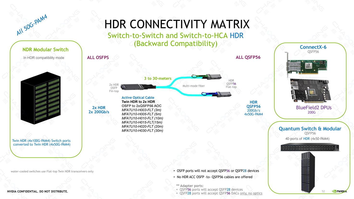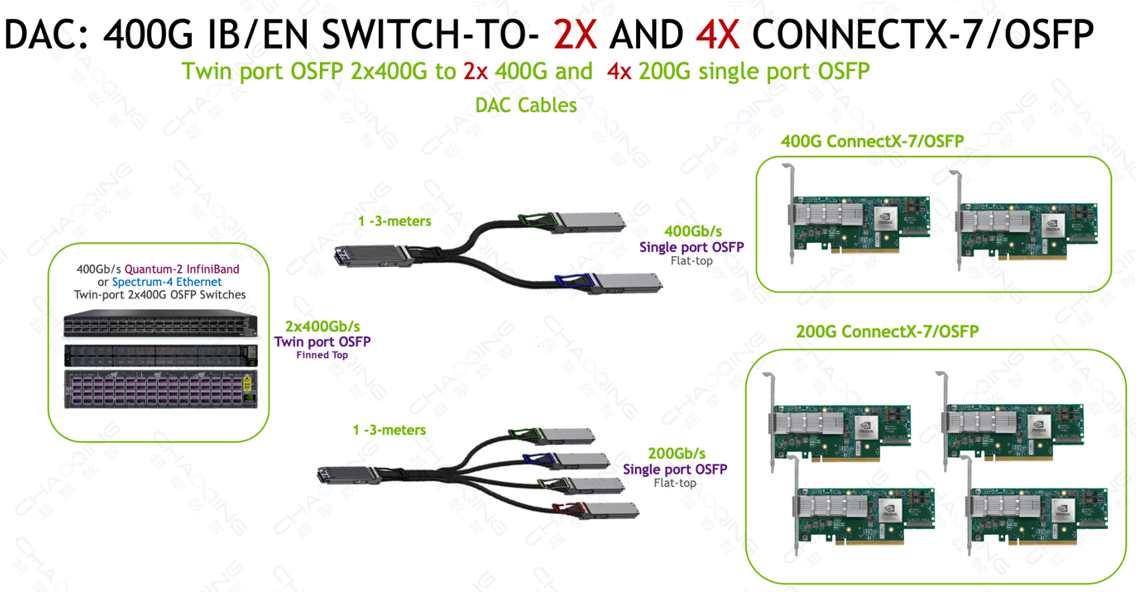 NDR Copper Cable的主要用途是将两个双端口、基于 OSFP 的 Quantum-2 InfiniBand 或 Spectrum-4 以太网交换机相互连接在一起,分为无源铜缆DAC和有源铜缆ACC,其中平顶Flat Top用于 DGX H800,翅片顶部Finned Top连接器用于 InfiniBand 或以太网交换机。