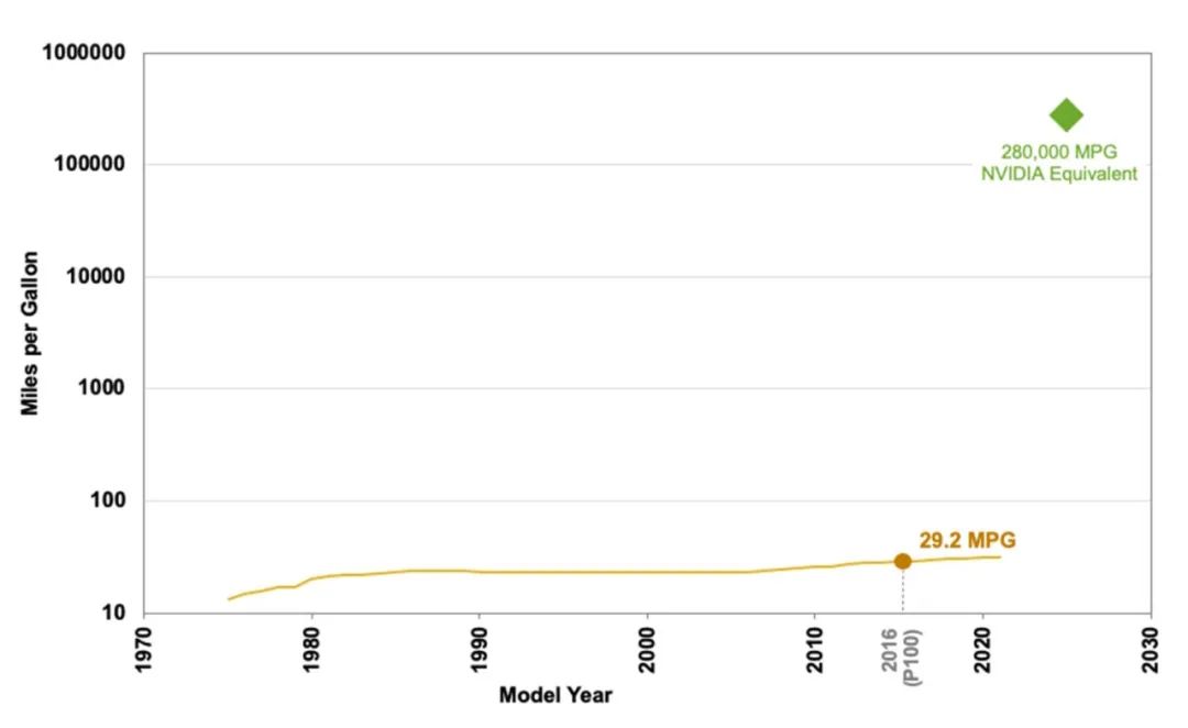 一个令人惊讶的数据:如果汽车效率的提升可以像 NVIDIA 在其加速计算平台上所实现的 AI 效率的提升一样高的程度,那么汽车的油耗可达到每加仑 28 万英里。这意味着你可以用不到 1 加仑的汽油开车到月球。