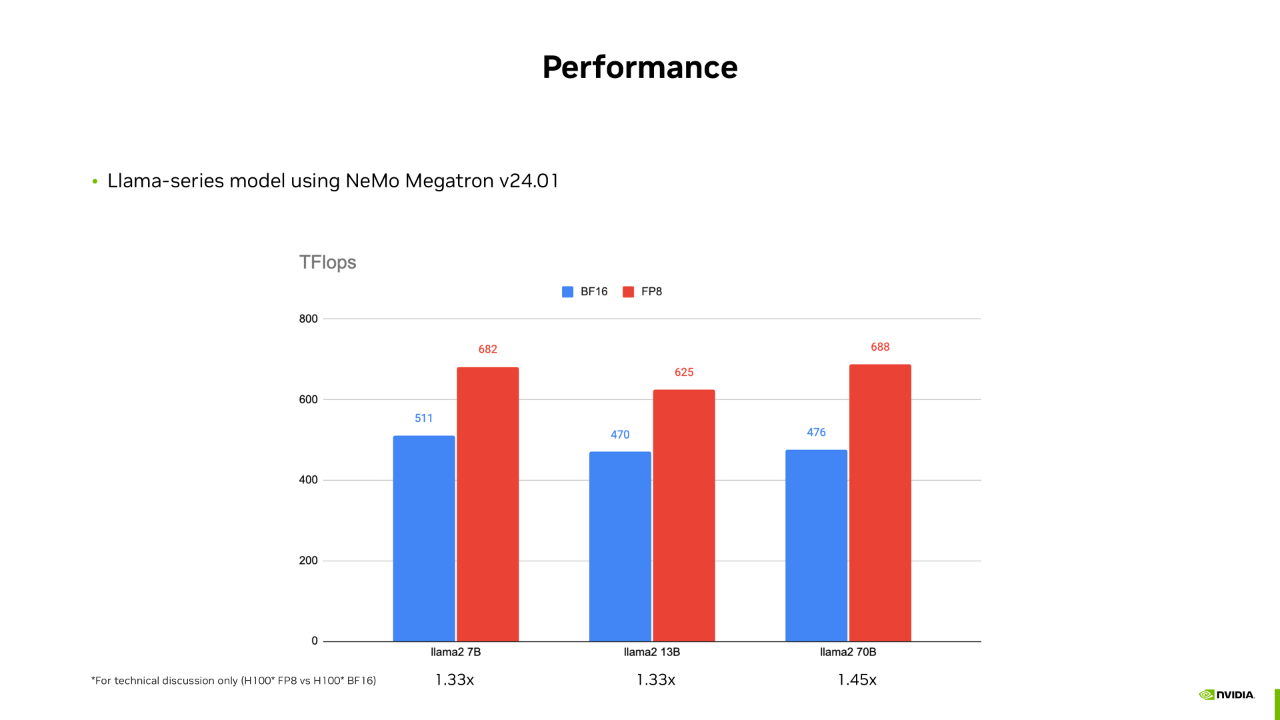 接下来是在另一张 GPU 上的测试结果,同样也是在 Llama 模型上进行预训练,镜像是 NeMo Framework v24.01。可以观察到 FP8 相对于 BF6 的加速比大约是 60%-73%。