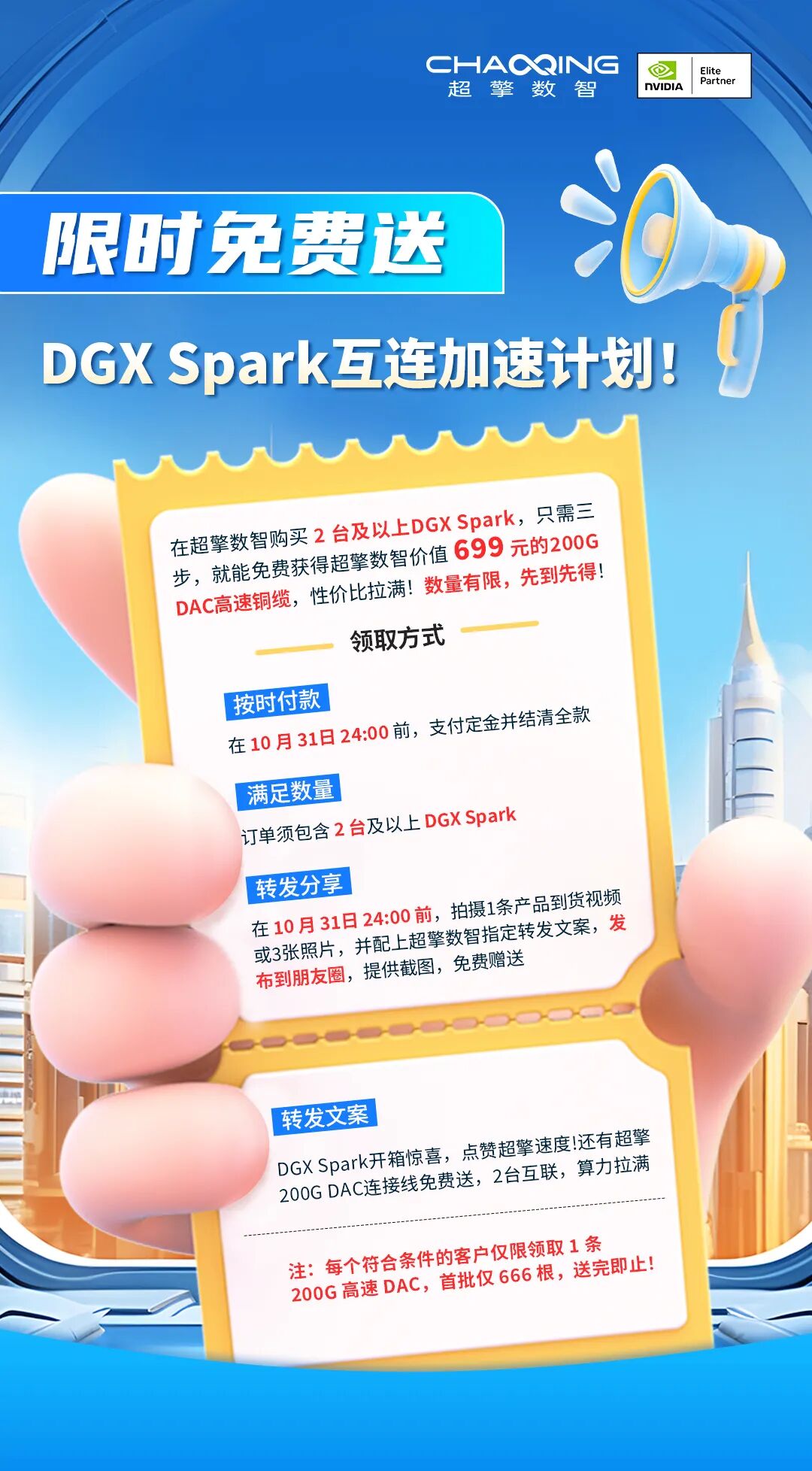 转发分享:10 月 31 日 24:00 前,拍摄1条产品到货视频或3张照片,并配上超擎数智指定转发文案:DGX Spark开箱惊喜,点赞超擎速度!还有超擎200G DAC连接线免费送,2台互联,算力拉满。发布到朋友圈,提供截图,免费赠送。