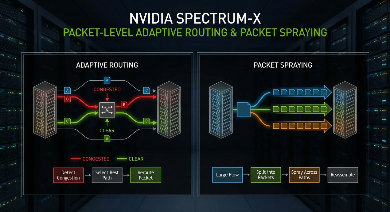 针对“象流”冲突问题,Spectrum-X 引入了包级自适应路由(Packet-level Adaptive Routing)与包喷洒(Packet Spraying)技术。