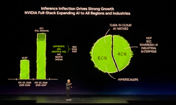 本届GTC最显著的变化,是 NVIDIA 对AI计算范式的重构:重心从单一的训练扩展至推理及其相关环节。在官方定义中,Vera Rubin平台被定位为同时面向训练(pretraining)、后训练(post-training)、测试扩展(test-time scaling)以及智能体推理(agentic inference)的统一计算平台。黄仁勋将推理市场的机会空间进一步上调至1万亿美元级别,这一判断也印证了 NVIDIA 对产业方向的预期:训练仍是基础,但推理、后训练与智能体执行,正在成为同等重要的工作负载。