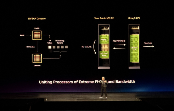 本届GTC的另一项重要硬件发布是Groq 3 LPU。它已被战略性整合进Vera Rubin平台中,专注于满足智能体系统中对低时延和大上下文处理能力要求更高的推理场景。随着推理过程里的Prefill和Decode阶段要求分化,推理系统正逐步转向更细的分工和调度。LPU的价值,恰恰就在于它更适合承接这类对低时延要求更高的推理部分。