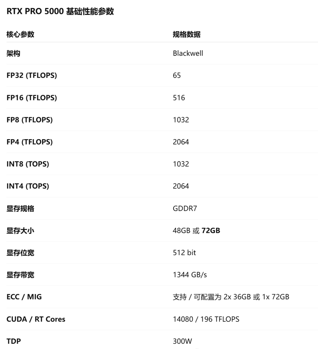 RTX PRO 5000基于 NVIDIA 最新的Blackwell架构,在算力、显存以及带宽等方面均实现了明显提升。其FP8与FP4等低精度算力能够达到更高水平,使其在AI推理场景中能够提供更高的吞吐能力。