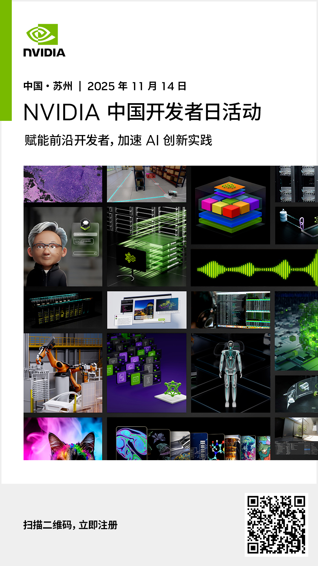 11月14日,年度重磅开发者盛宴 — NVIDIA 中国开发者日活动将在苏州国际博览中心 G 馆举办,大会面向全国开发者、AI 爱好者与行业领袖开放。