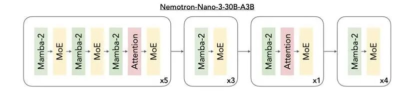 图 1:Nemotron 3 混合架构。通过交错部署 Mamba-2 与 MoE 层,辅以少量自注意力层,在保持领先精度的同时实现推理吞吐量最大化。
