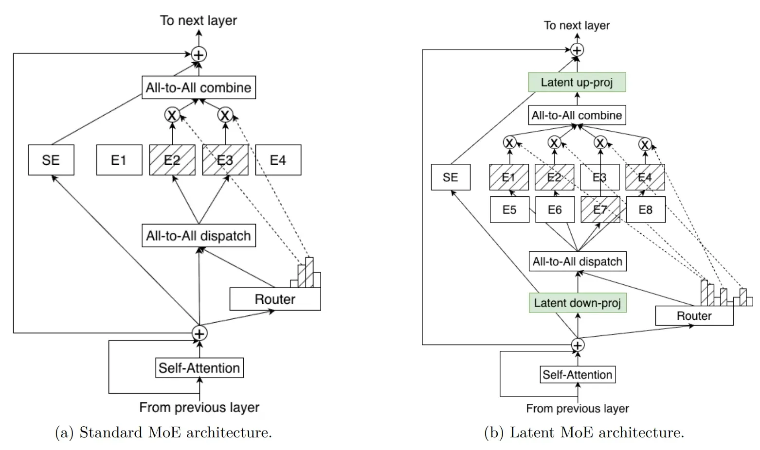 图 3:标准 MoE 与潜在 MoE 架构对比。在潜在 MoE 中,token 被投影至更小的潜在维度进行专家路由与计算,在降低通信成本的同时支持更多专家参与,并提高每字节精度。