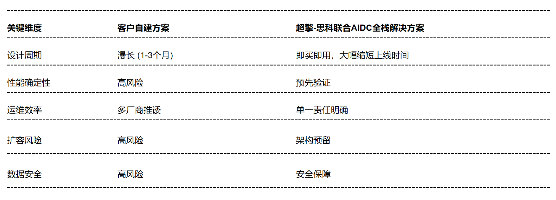 选择超擎数智与思科的AIDC全栈解决方案,即是选择经过深度集成、全面验证、可立即赋能业务的AI系统。与客户自建的模式相比,该方案在关键环节具备显著优势: