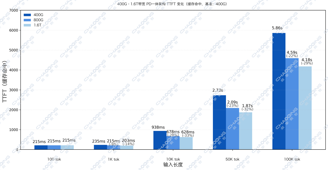 当东西向的带宽,从基准的400G提升至1.6T时,100K场景下的TTFT降低了29%。