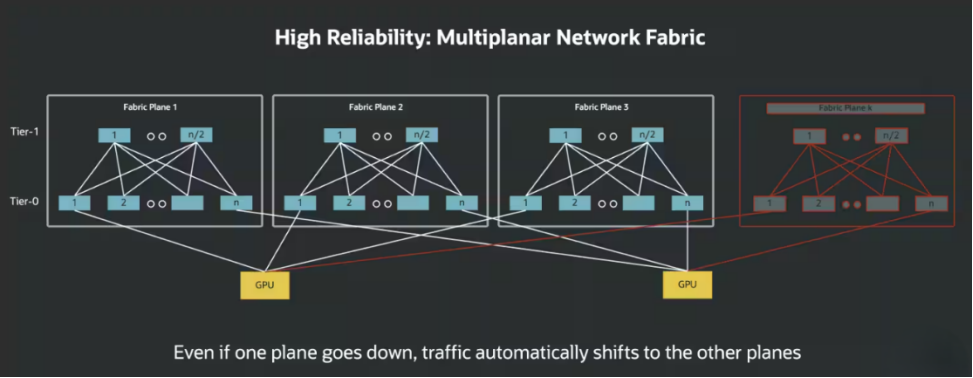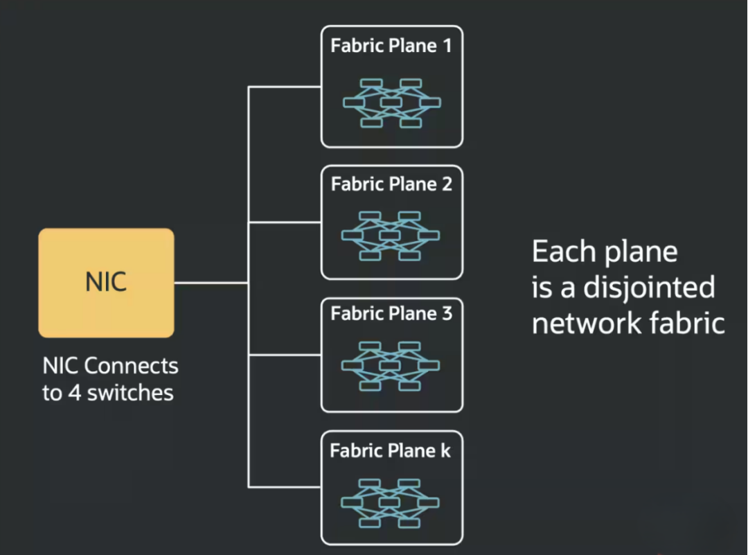 多平面网络架构的核心特征在于“跨平面分布”:将整个数据中心的交换矩阵分割为多个独立的平面。每个平面承载部分流量,多平面并行工作,从而提供完整的带宽和冗余能力。